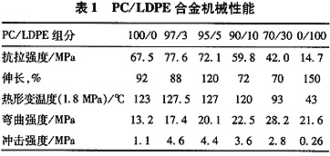 由于PC的結(jié)構(gòu)使其具有[JuYou]良好的物理改性和化學修飾的能力,隨著人們對高分子材料結(jié)構(gòu)與性能關(guān)系的深入認識,更多的性能優(yōu)異的PC品種及材料會被逐步地開發(fā)出來。文獻[23]介紹了以界面縮聚法由二苯基芳馬龍二酚合成的PC,其特性黏度為1.145dL/g,玻璃化溫度為293℃,提高PC的耐熱等級的同時,也應(yīng)保證其具有[JuYou]足夠的韌性。帝人化成公司在PC中加入適當?shù)牡兔芏染垡蚁↖DPE),可大大提高PC的抗沖擊強度,并且耐沸水和開裂性也有所改善,加工性能良好[24],見表1。從用戶接受其性價比高的角度去看,在PC中加入3%-5%的LDPE材料表現(xiàn)出的抗沖擊強度等性能指標都比純PC要好,而LDPE的價格要比PC便宜得多,開發(fā)出此類產(chǎn)品[ChanPin]用戶就會歡迎。